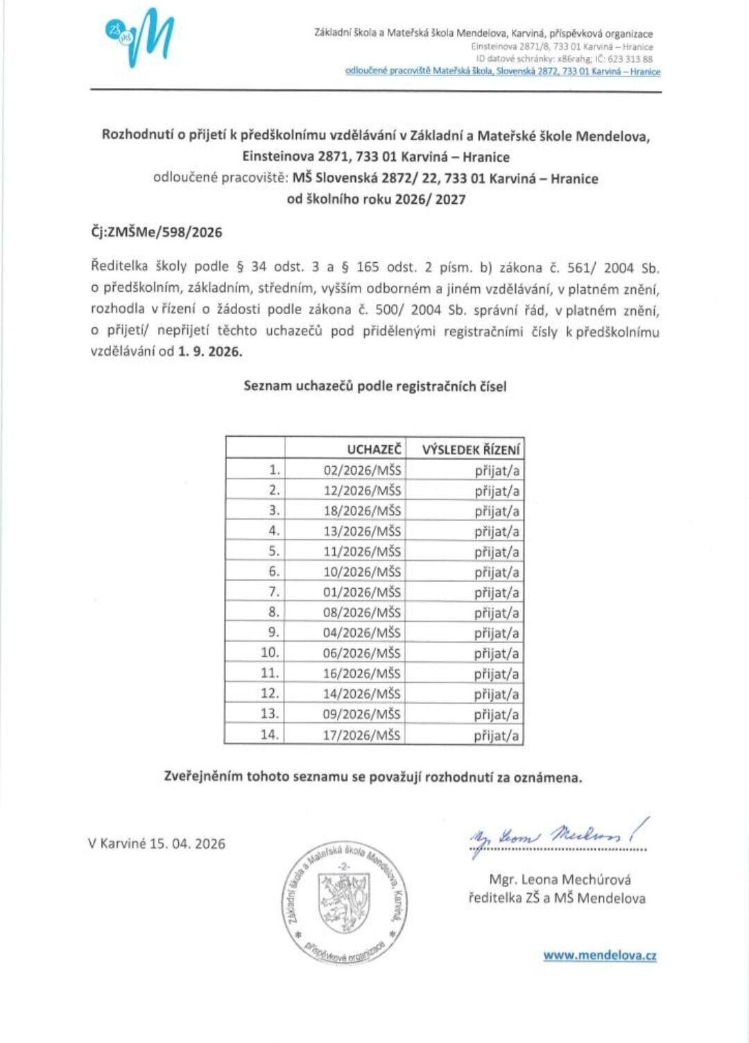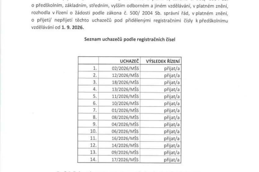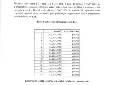 Rozhodnutí o přijetí k předškolnímu vzdělávání 2026/ 2027